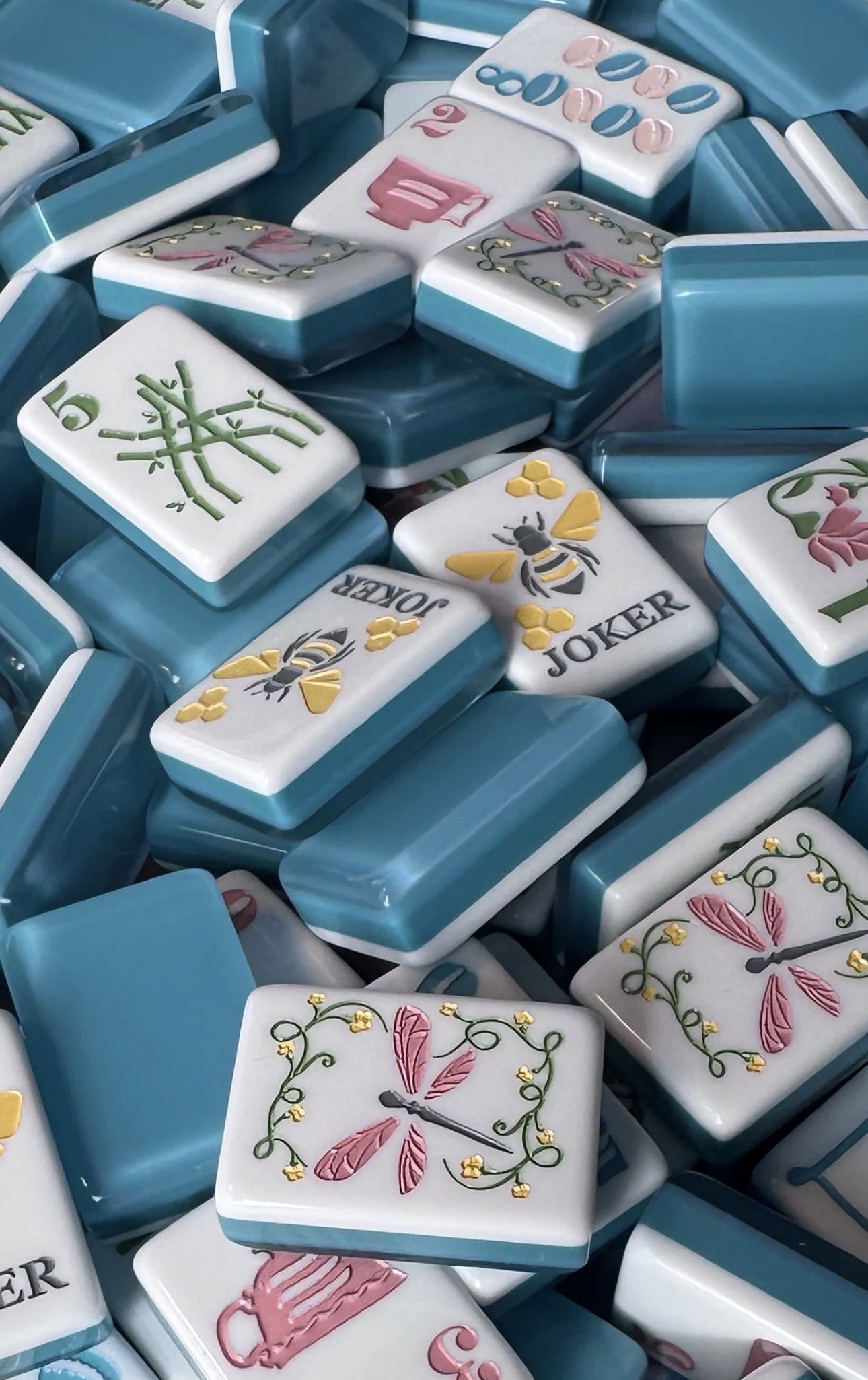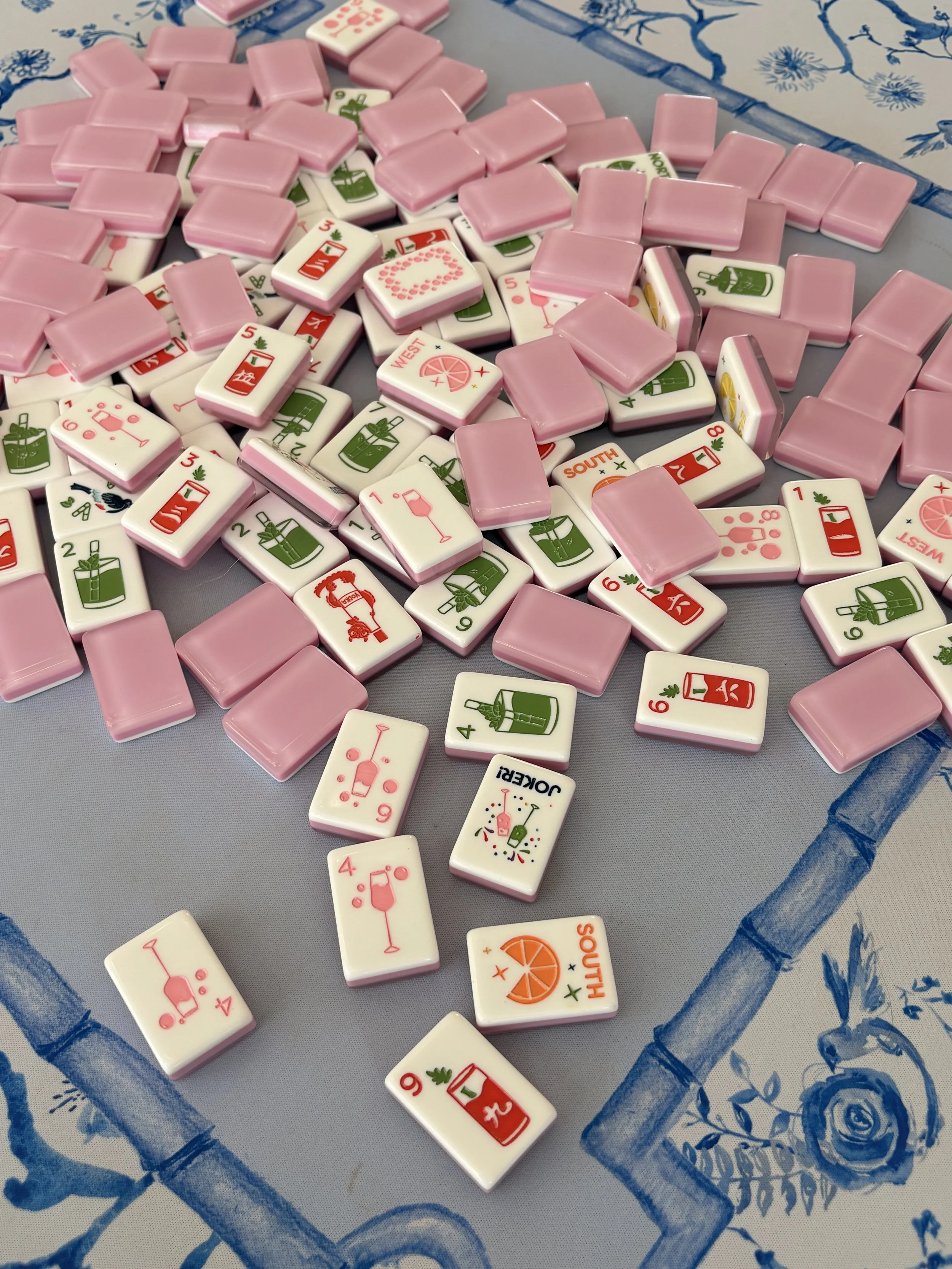 Mahjong tiles with flair and style, designed here in Greensboro, NC! We can’t get enough of these stunning bumblebee jokers and fun cocktail tiles.